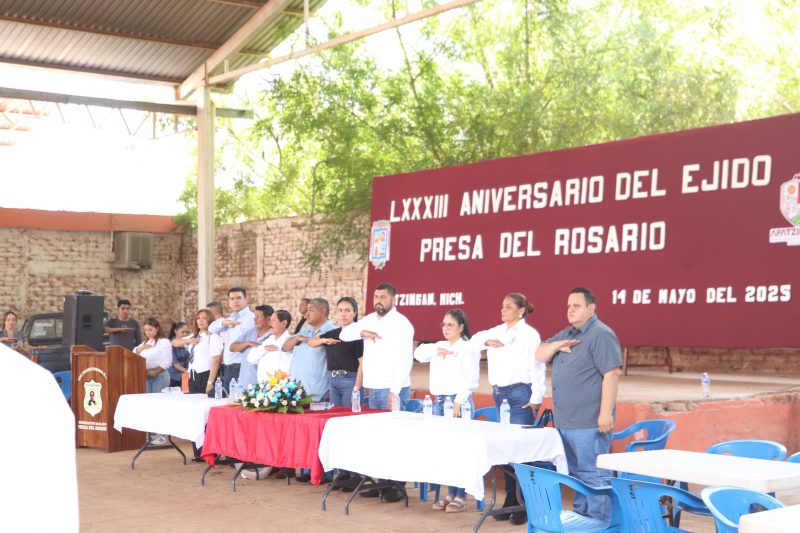 Apatzingán Michoacán a 15 de Mayo del 2025.- Durante la celebración del 83 Aniversario de la creación del Ejido Presa del Rosario, la presidenta municipal, Fanny Arreola Pichardo acompañada por autoridades ejidales, encabezaron el acto cívico conmemorativo a la importancia de la fecha, donde destacó la productividad que tiene el ejido en temas agrícolas.